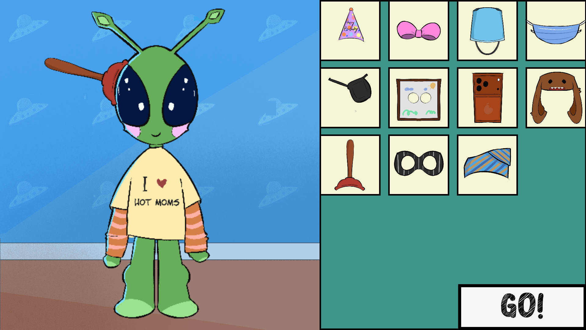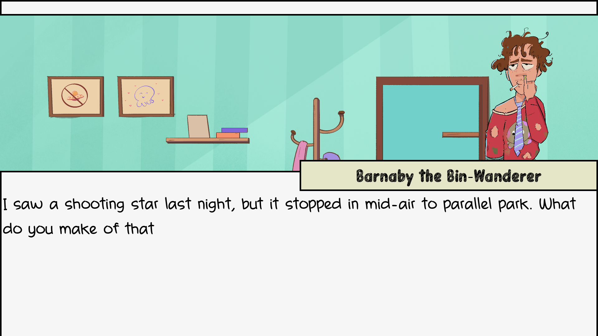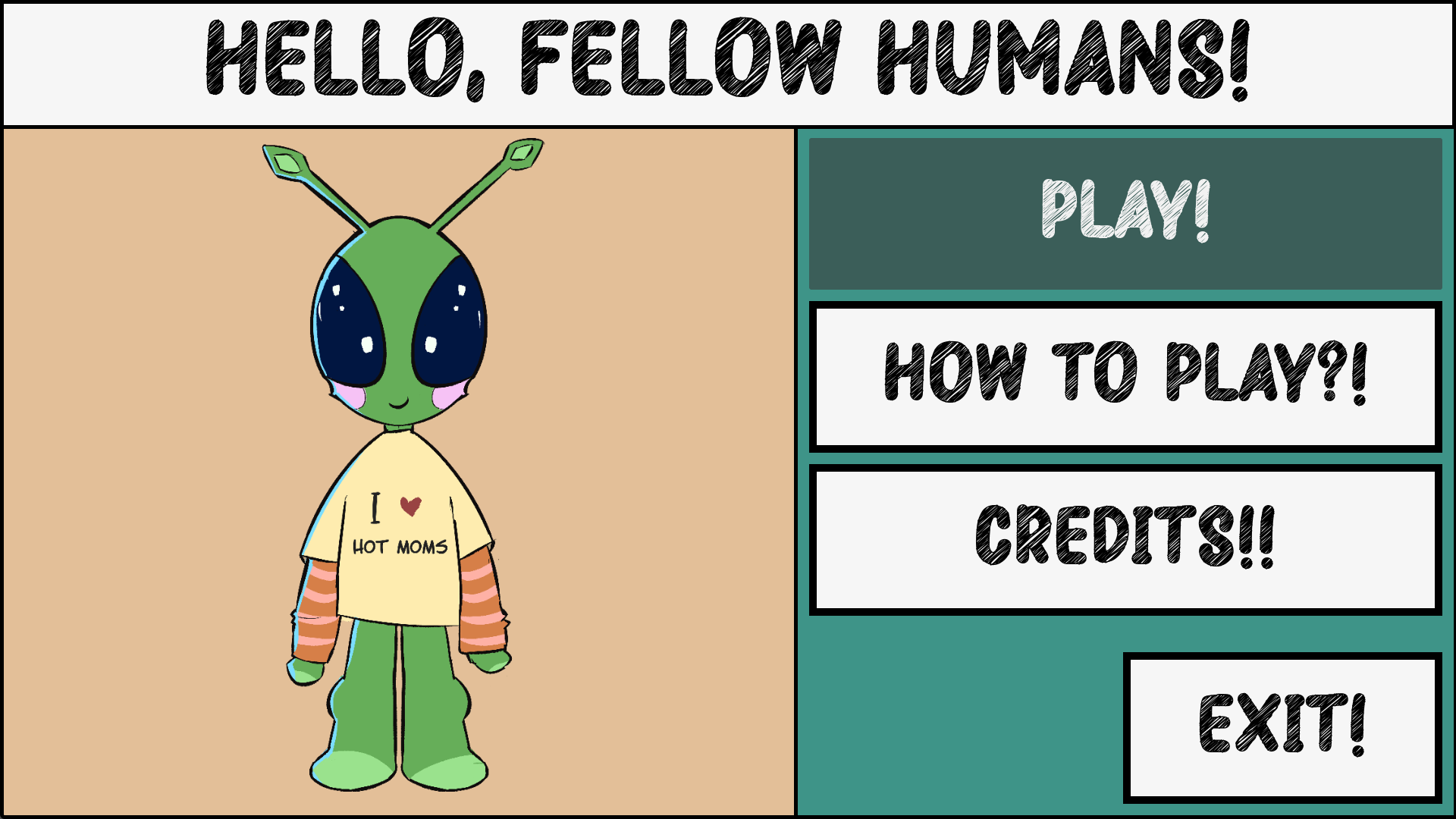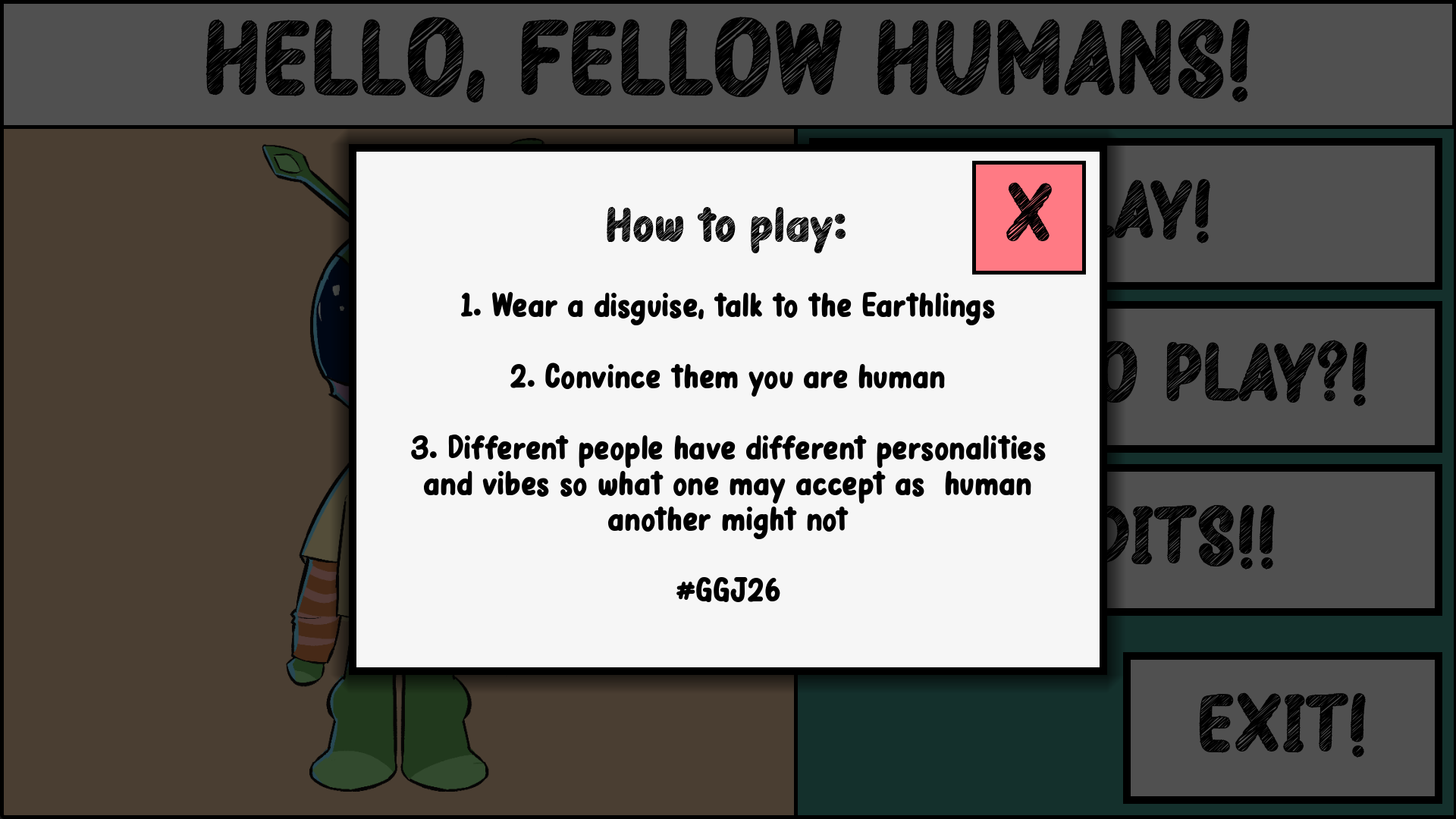 You are an alien who has just landed on Earth; your survival and trust of the locals depend on your ability to blend in. In this hand-drawn narrative comedy, you must put on a disguise and respond to questions from suspicious characters without blowing your cover. What you say affects how convincing you are as a human. The game plays with internet culture, social awkwardness, and the absurdity of trying to pass as something you’re clearly not.